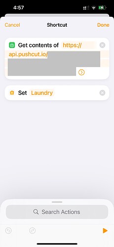 The shortcut calls my PushCut URL triggering my Reminder, and also sets a laundry scene that can change a lightbulb blue or send an audio file to my HomePods if needed.