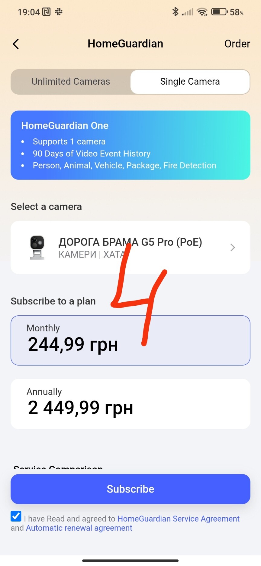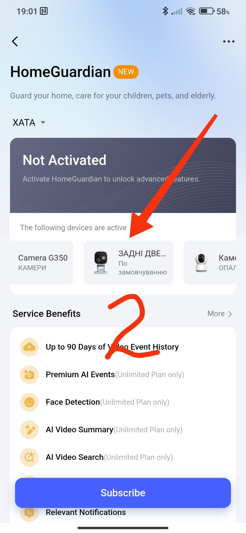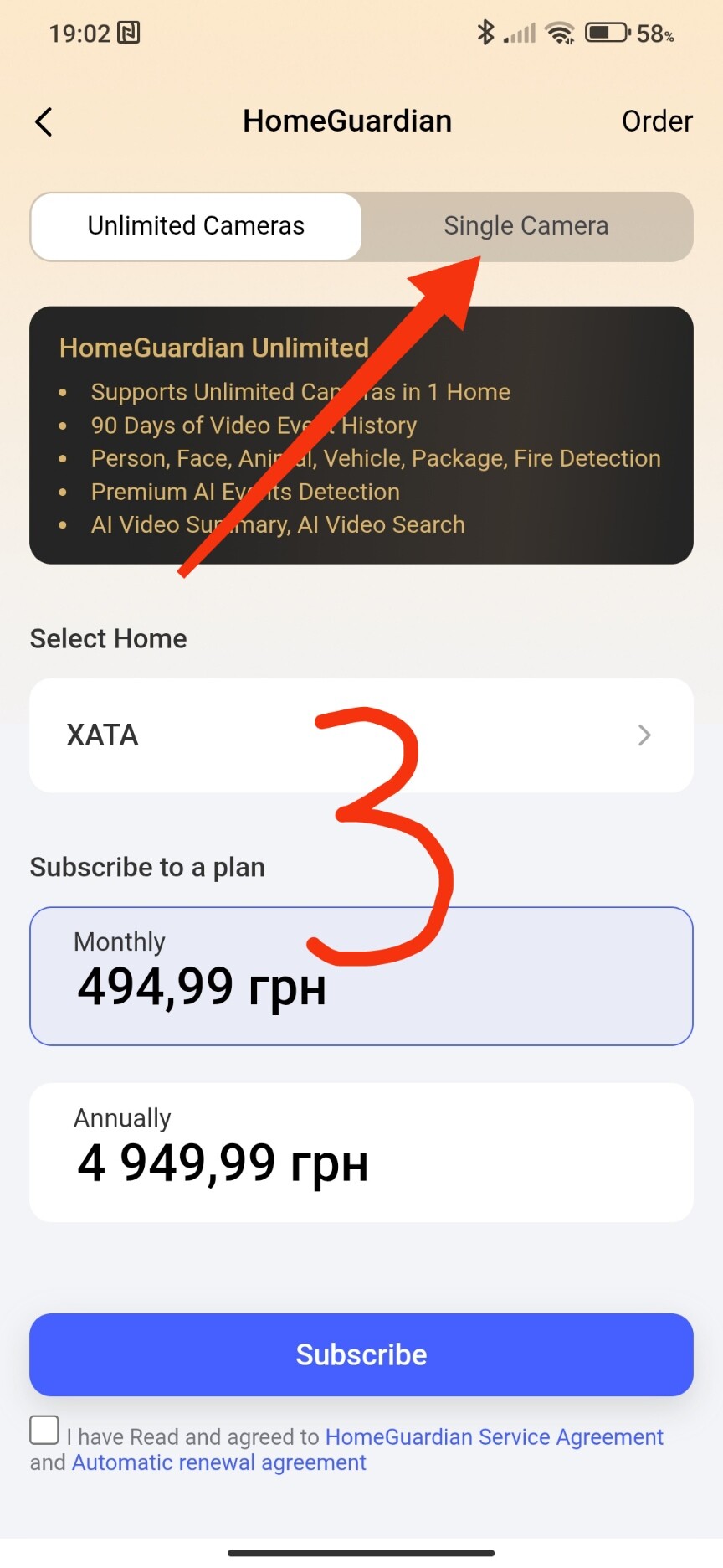 To purchase a paid subscription, you need to go to the app settings page and take the following steps to select the desired camera