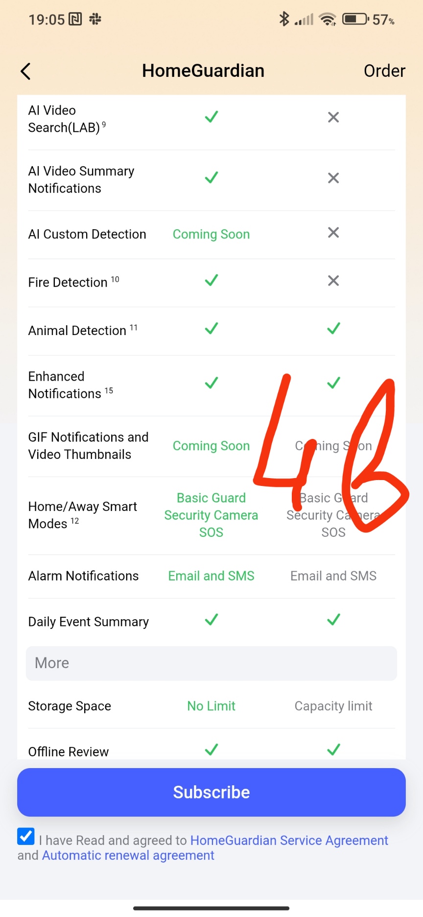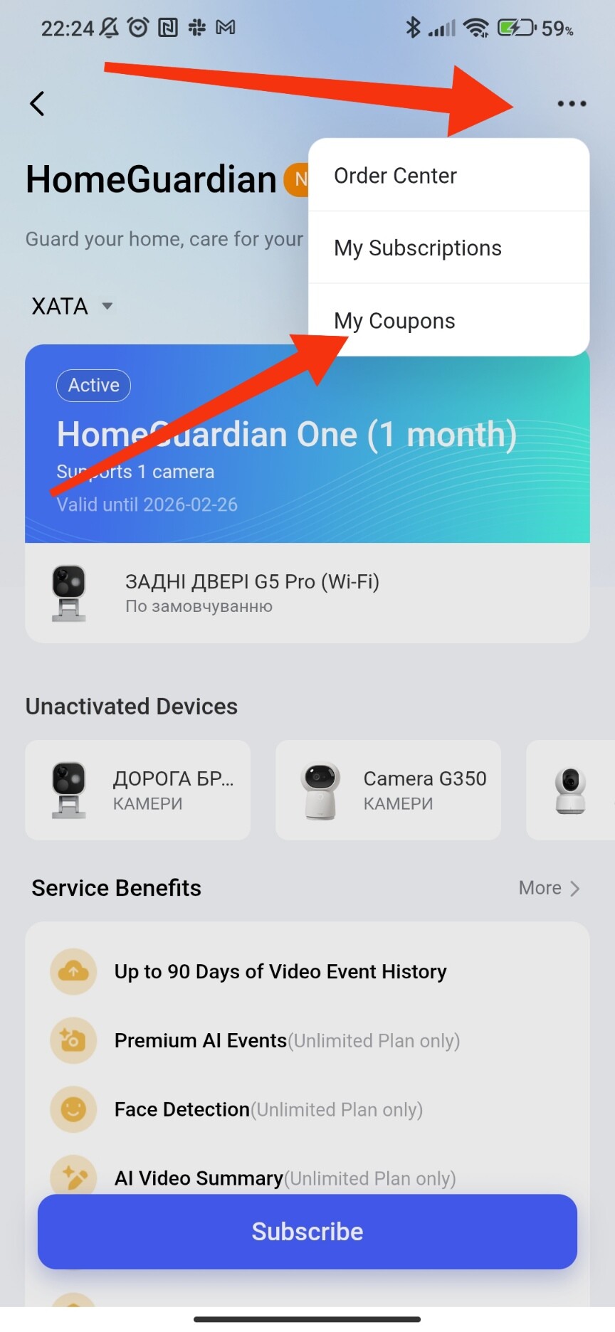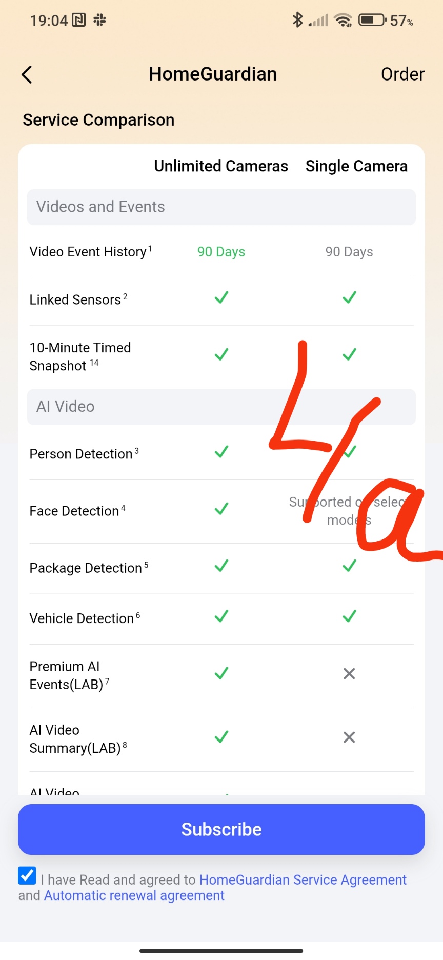 To purchase a paid subscription, you need to go to the app settings page and take the following steps to select the desired camera