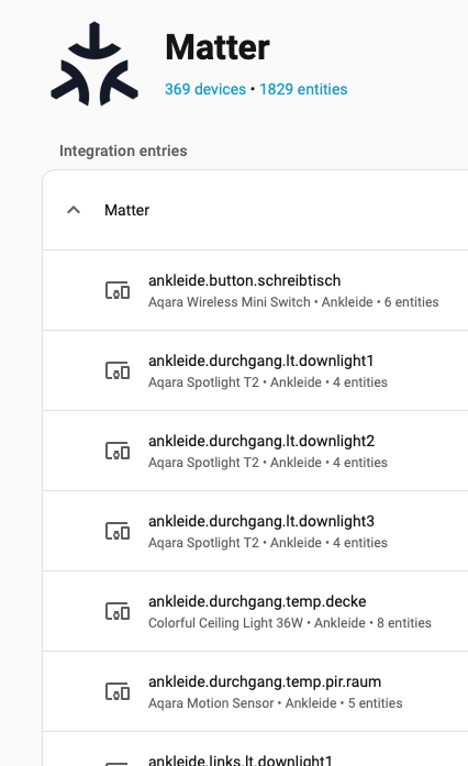 I currently have 458 Aqara devices installed, but Home Assistant only shows 369 Matter devices — and that number even includes some Matter devices that aren’t Aqara at all.