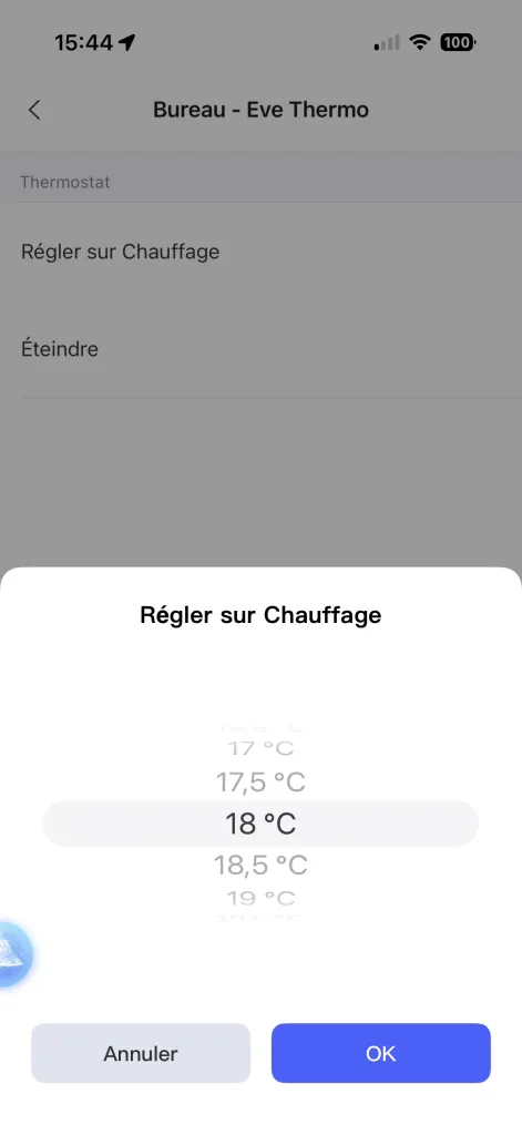Concrete example: an EVE Thermo thermostat set to 18 °C in the office via a synchronized scene.