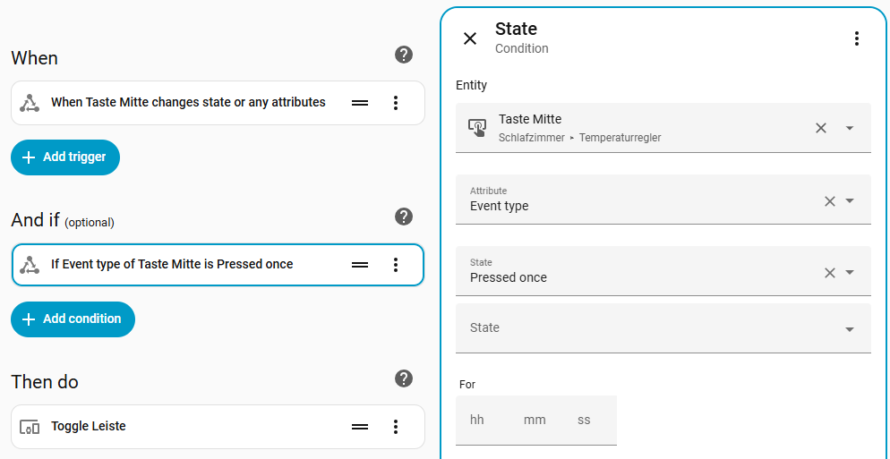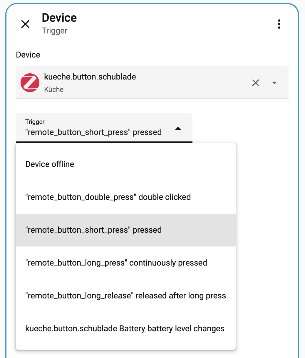 In HA I can see the button presses — single, double, long press — but I can’t actually use them as triggers for automations. The only event I can select is a battery level change. And unless someone in my house spends the whole day pressing that switch really aggressively, that event isn’t all that useful.