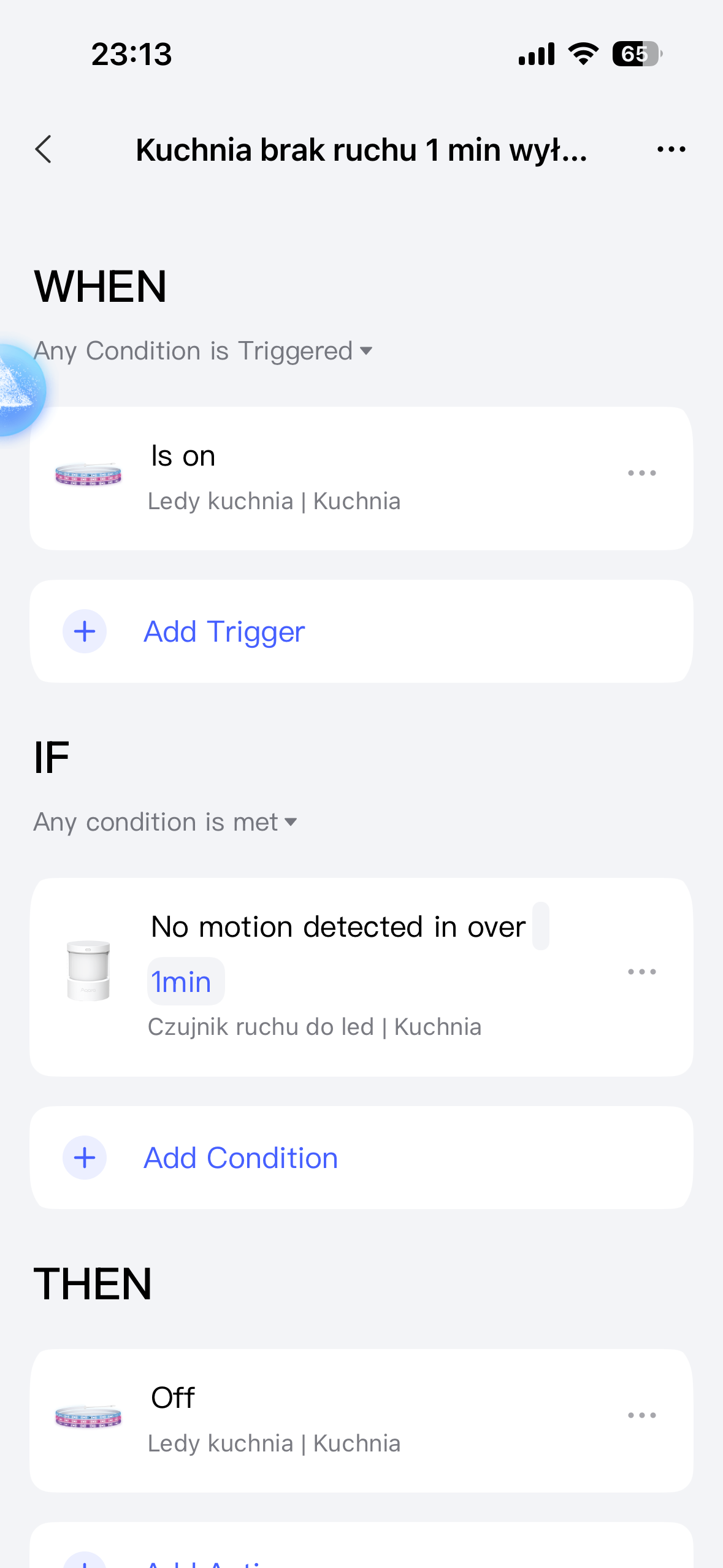 I’m having a problem with creating an automation for LEDs with a motion sensor. I’m trying to set up the following automation: when the LED is turned on, if the motion sensor does not detect any movement for more than one minute, then turn off the LEDs. Unfortunately, this automation is not working for me.