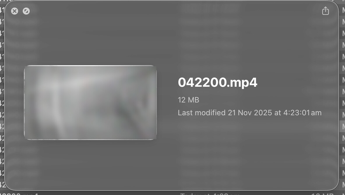 In Finder (MacOS) the Quick Look feature is useful to quickly skim through footage. The .mp4 video files from my DoorbellG4 work fine, so I can play, pause etc within Finder. But the .mp4 files from my E1 camera don’t play in Quick Look, I have to open them in Quicktime (or other video players).