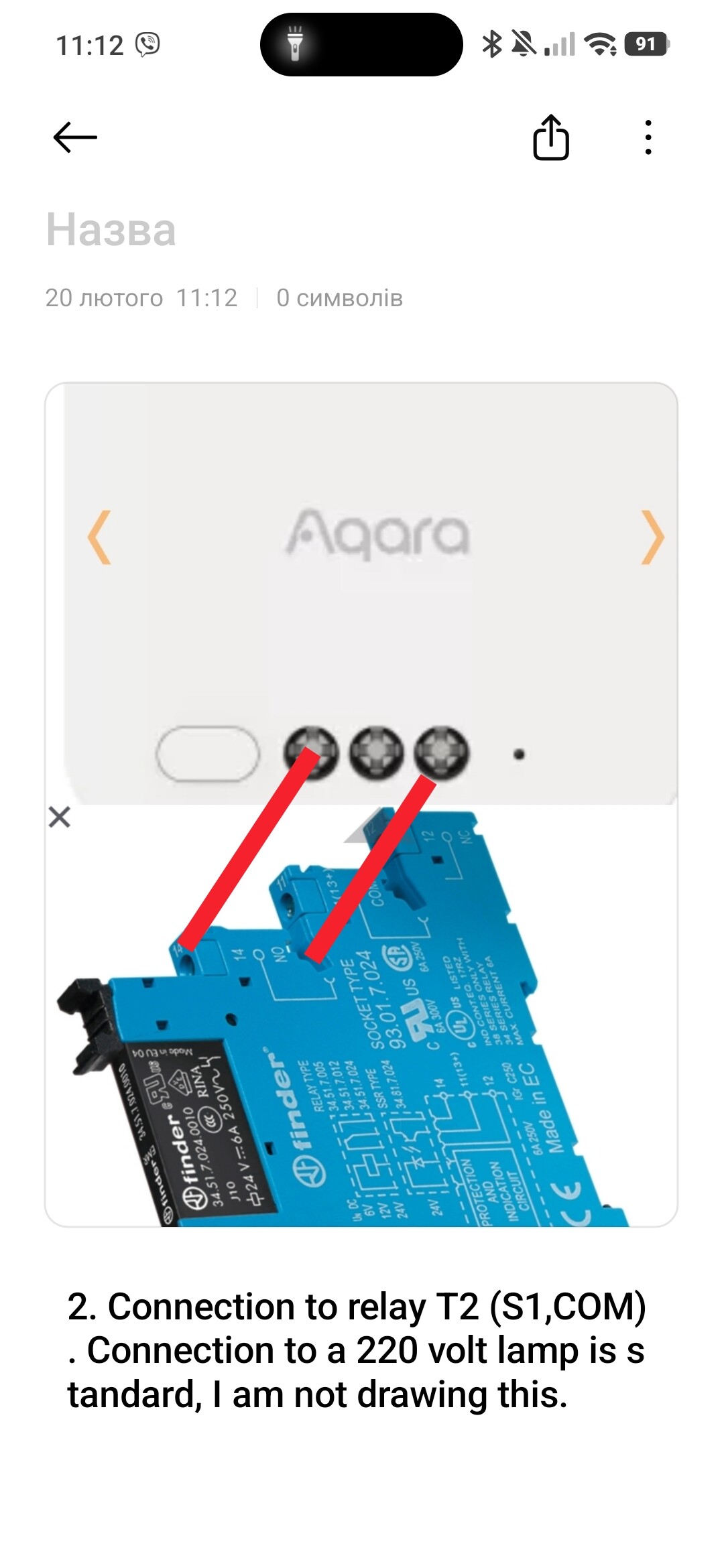 Z przekaźnika wejście 14 pidpioołem pod S1 Aqary, wejście 11 z przekaźnika wpiąłem do COM Aqary.