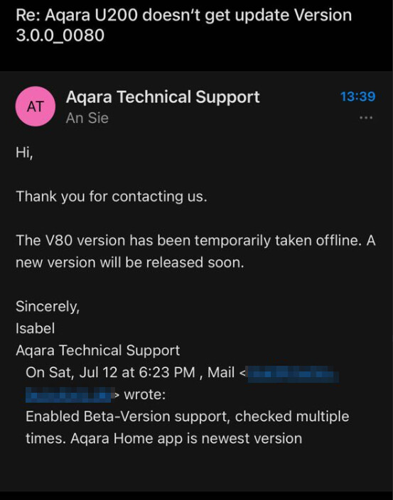 I reached out to the aqara support as my U200 didn’t get the latest firmware update. This is there response. I guess from reading others topics here and in different threads, there has been quite a few issues with this version.