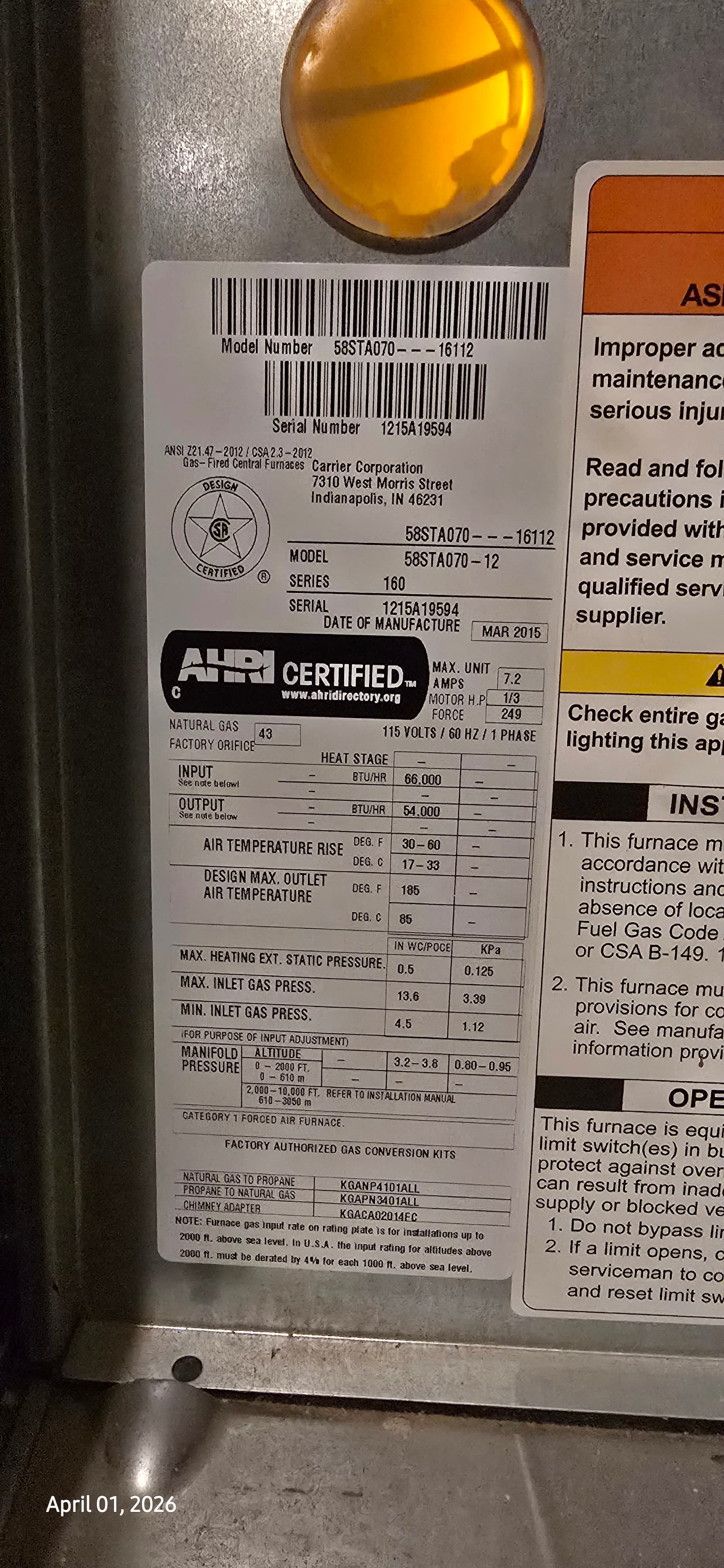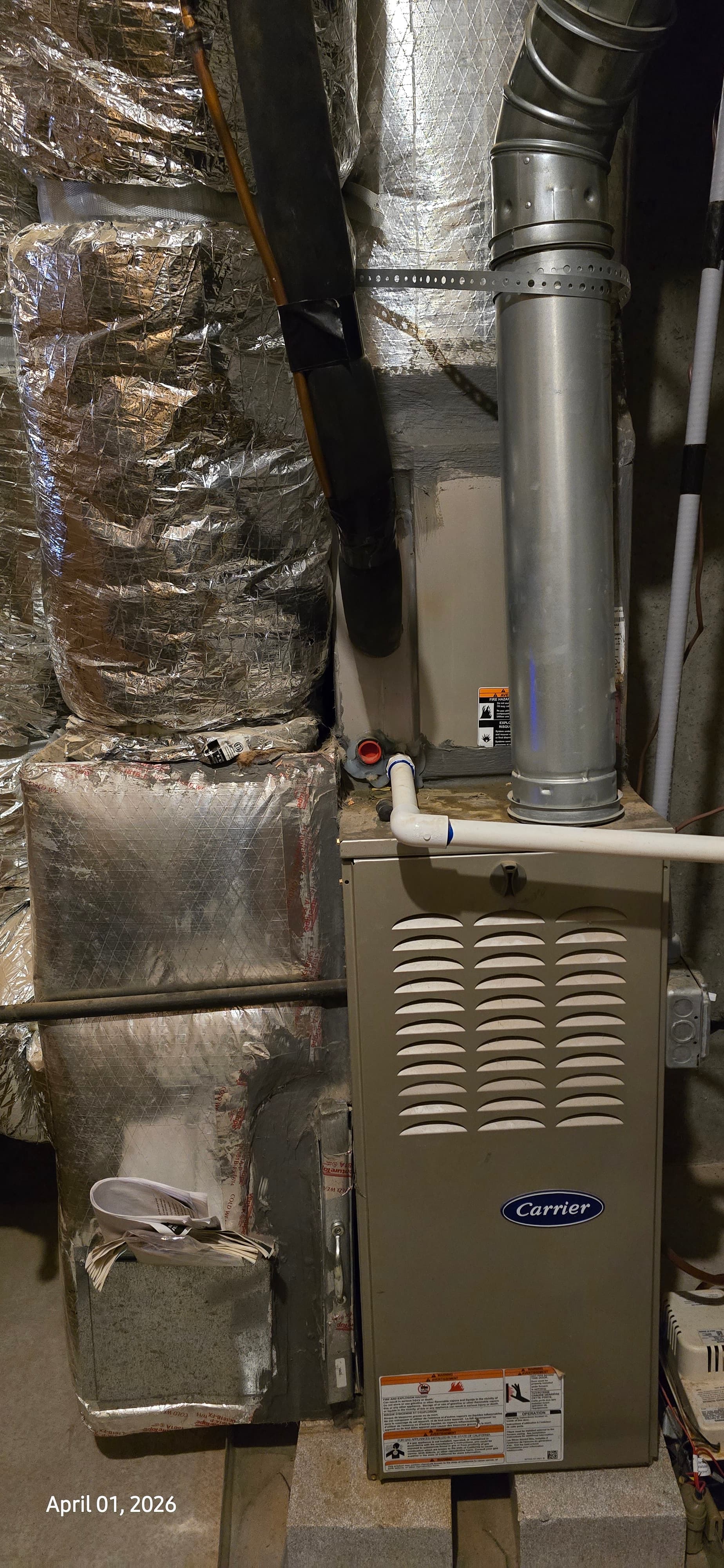 - I’ll get specifics but there’s a gas furnace in the basement with blower and a 2ton condenser outside. Carrier units.