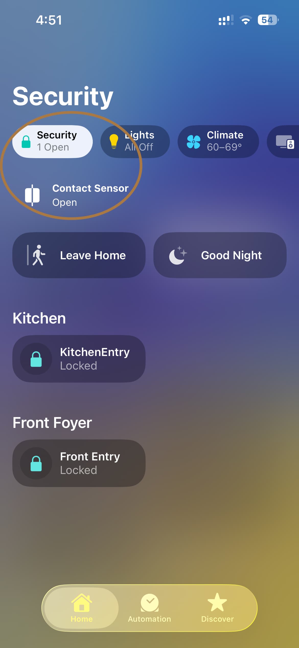 I simply want the door open/close sensor to be an ordinary accessory in the Apple Home app…not a “security” accessory.