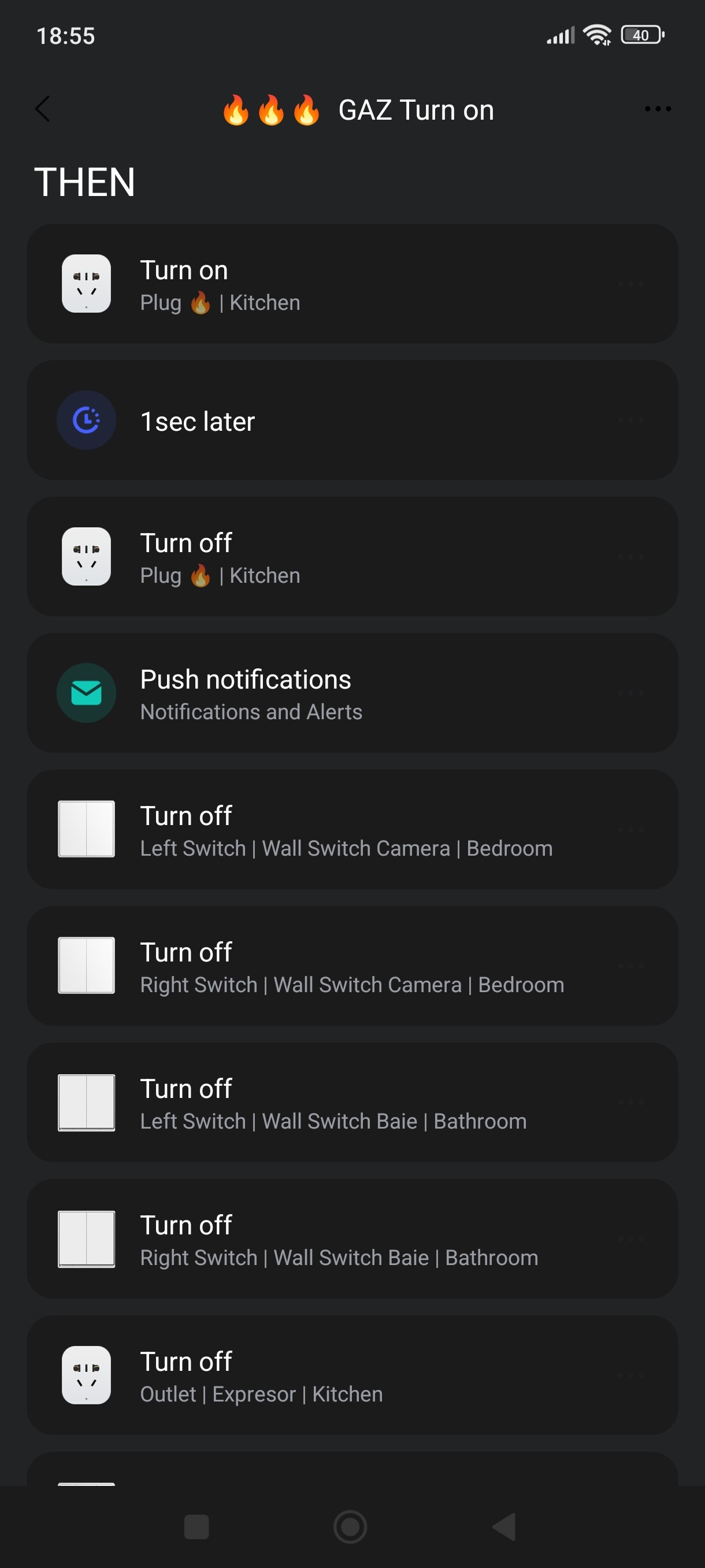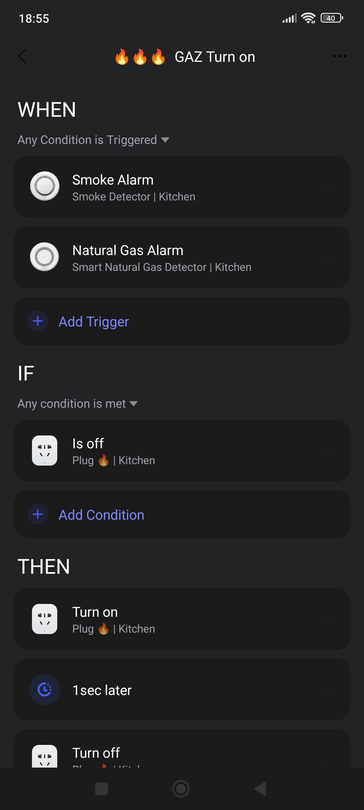 The main actors in the following film are: the Aqara smoke detector, the Aqara gas detector, the Aqara smart socket and the unknown solenoid valve for methane gas. In the supporting role: the Aqara socket and switches. When smoke/gas is detected, the smart socket transmits an electrical impulse to the valve, the valve that closes the methane gas pipe that supplies the boiler and the cooking hob, an action followed by the closing of all the lights and all the sockets, TVs. Below you can find the printscreen. with the designed automation. Enjoy.