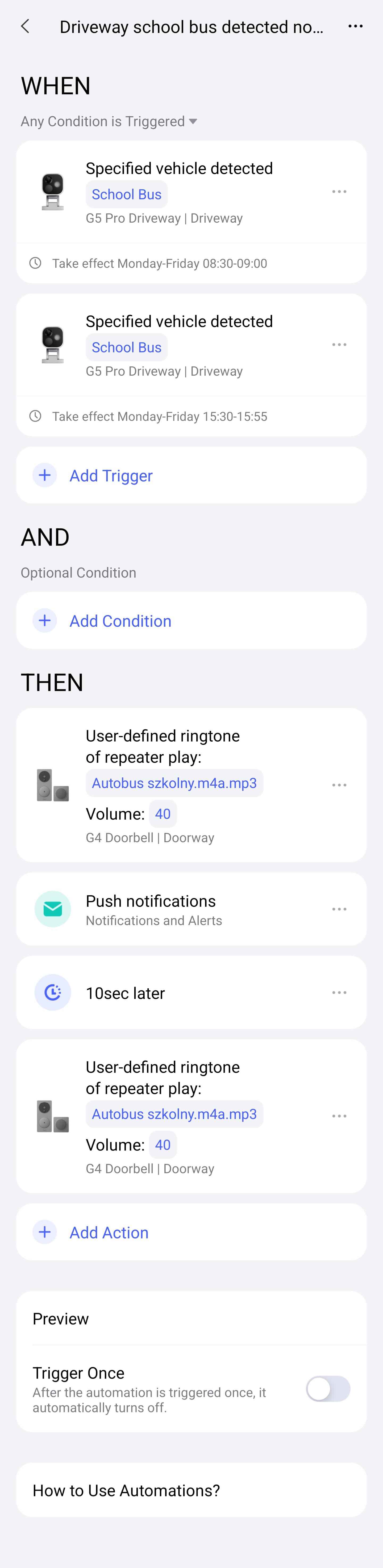 The issue is that it triggers every time any bus of a similar color passes the area, even when it’s moving fast.