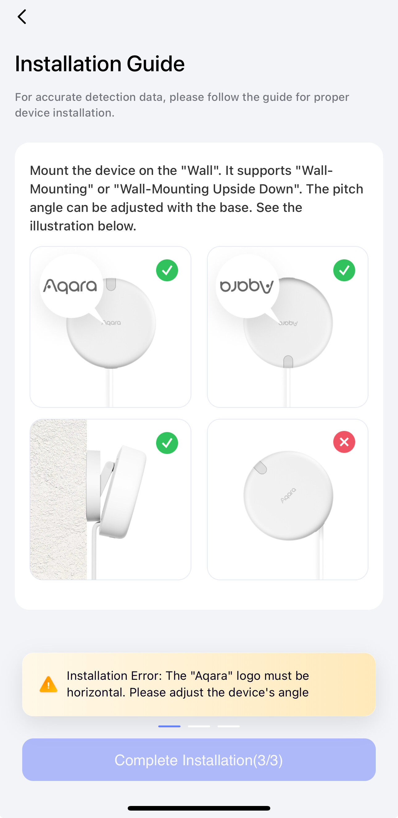 Position Adjustment: Make sure the sensor is mounted either on the ceiling or wall as per the recommended method depending on your setup height. The Aqara logo should be parallel to the floor or ceiling.