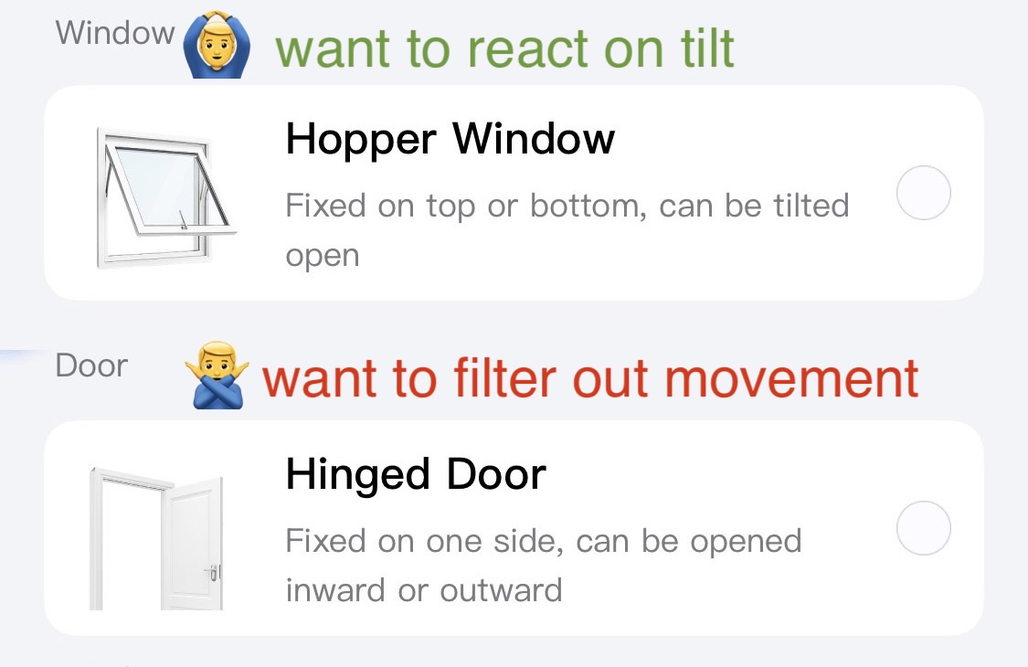 Ideally, I want to trigger a notification when the lid tilts (like a ‘Hopper Window’), but filter it out if the entire door also swings open (like a ‘Hinged Door’).
