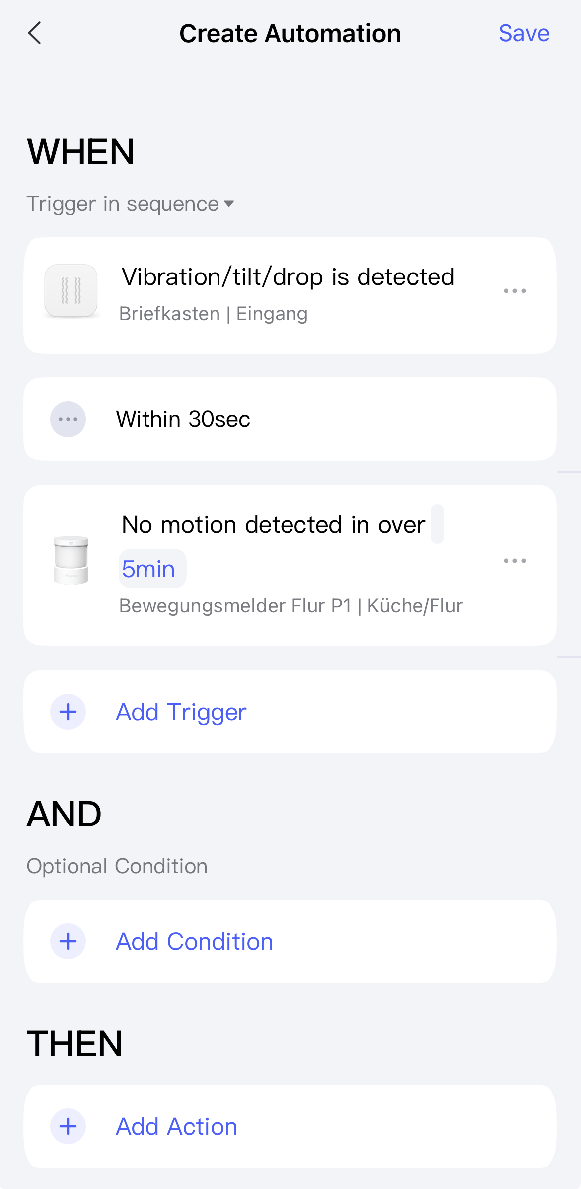 Then, of course, there’s the issue of wanting to filter out the door movement. With Fall detection, this should theoretically be possible, since you could define the “Fall” as the trigger in the automation and check in the “IF” condition whether there is a general movement of the door. Unfortunately, I don’t have the specific sequence in mind for how opening the door via the hidden latch inside works in practice.