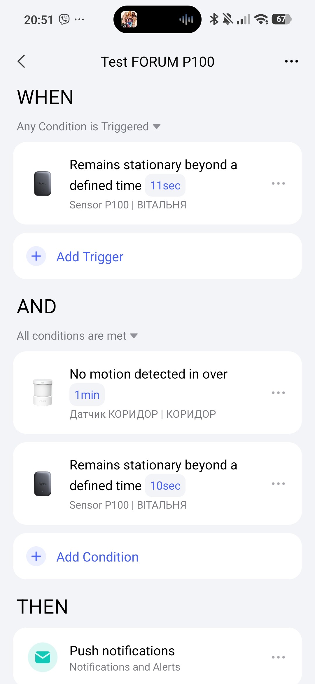 EXPLANATION, we currently cannot use the “motion” or “movement” trigger in the WHEN section due to the lack of the “delay” condition, the IF section with the P100 condition sensor will always be unready for analysis in the “rest” state. Therefore, I used “no motion” in the WHEN and the group “no motion motion sensor” and “no motion P100” in the IF section. Please note that the time in the WHEN section should always be longer than in the IF section (preparation of the condition for readiness P100).
