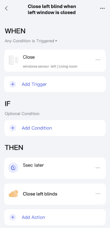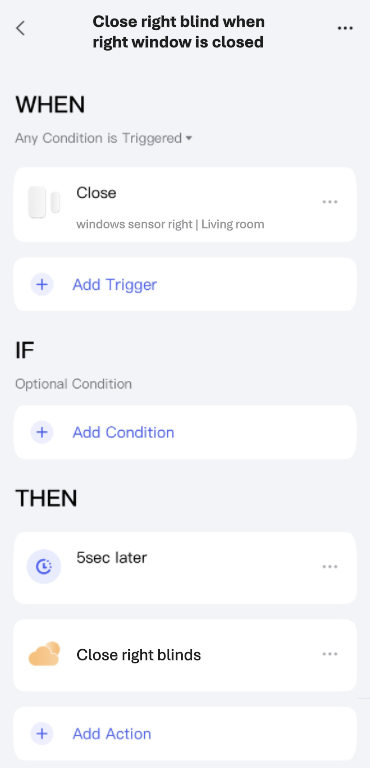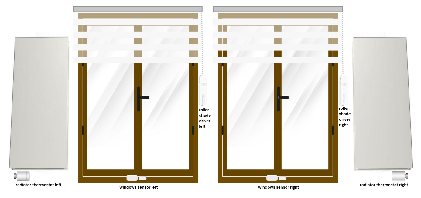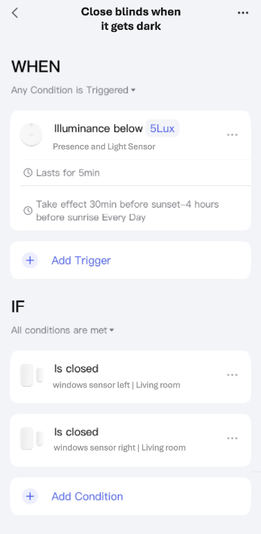 And an automation that closes the blinds in the evening when it gets dark (only if the windows are closed, of course):