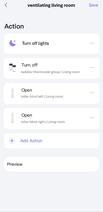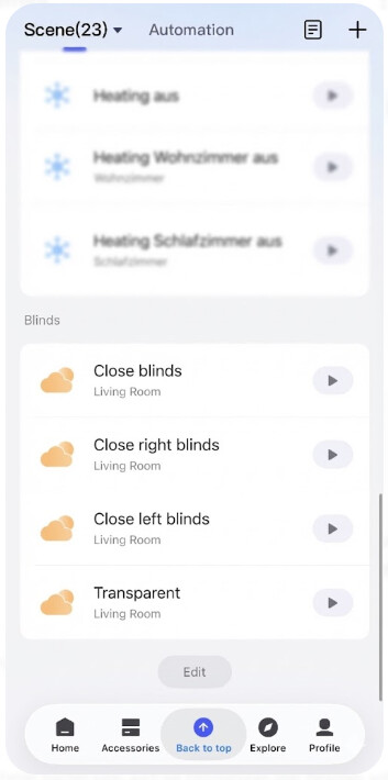 One of these scenes takes into account the time setting, determining whether a roller blind should be completely or partially closed, while the other scene always opens the roller blinds to be semi-transparent, if desired. If you want, you can also create a scene that closes the blinds at any time. But Siri understands “close all blinds in the living room” even without an extra scene. Don’t forget to add the required scenes to Apple Home.