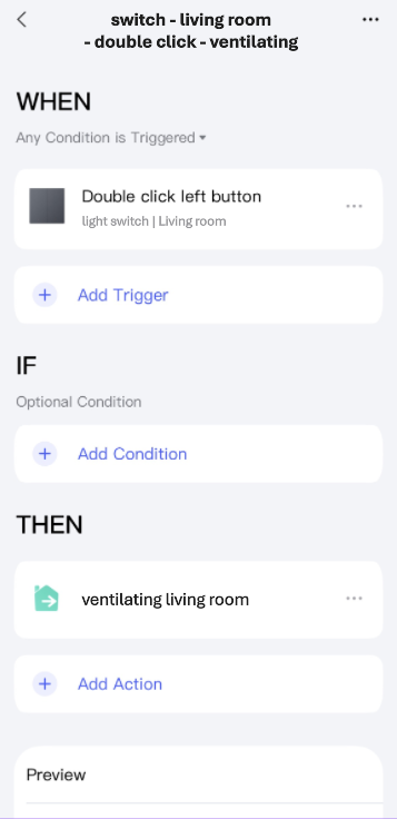 - Alternatively, the ventilation scene can be started by double-clicking the light switch. This is for when you don’t want to talk to Siri or the other way around.