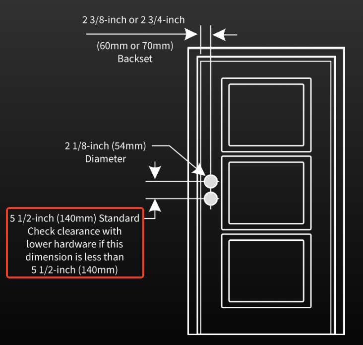 Please refer to the attached screenshot for the recommended clearance between the lock and the lower door handle to ensure proper installation.
