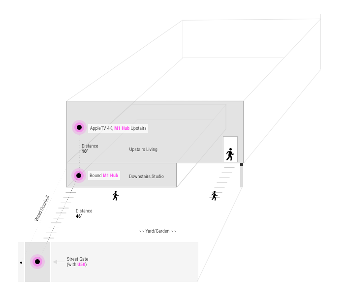 ~10’ vertical distance above the studio and bound M100 sits our primary living residence. An AppleTV 4k, Eero router for fiber, and another M100 hub sits upstairs, too but nothing in visual distance of the gate, down on the street.