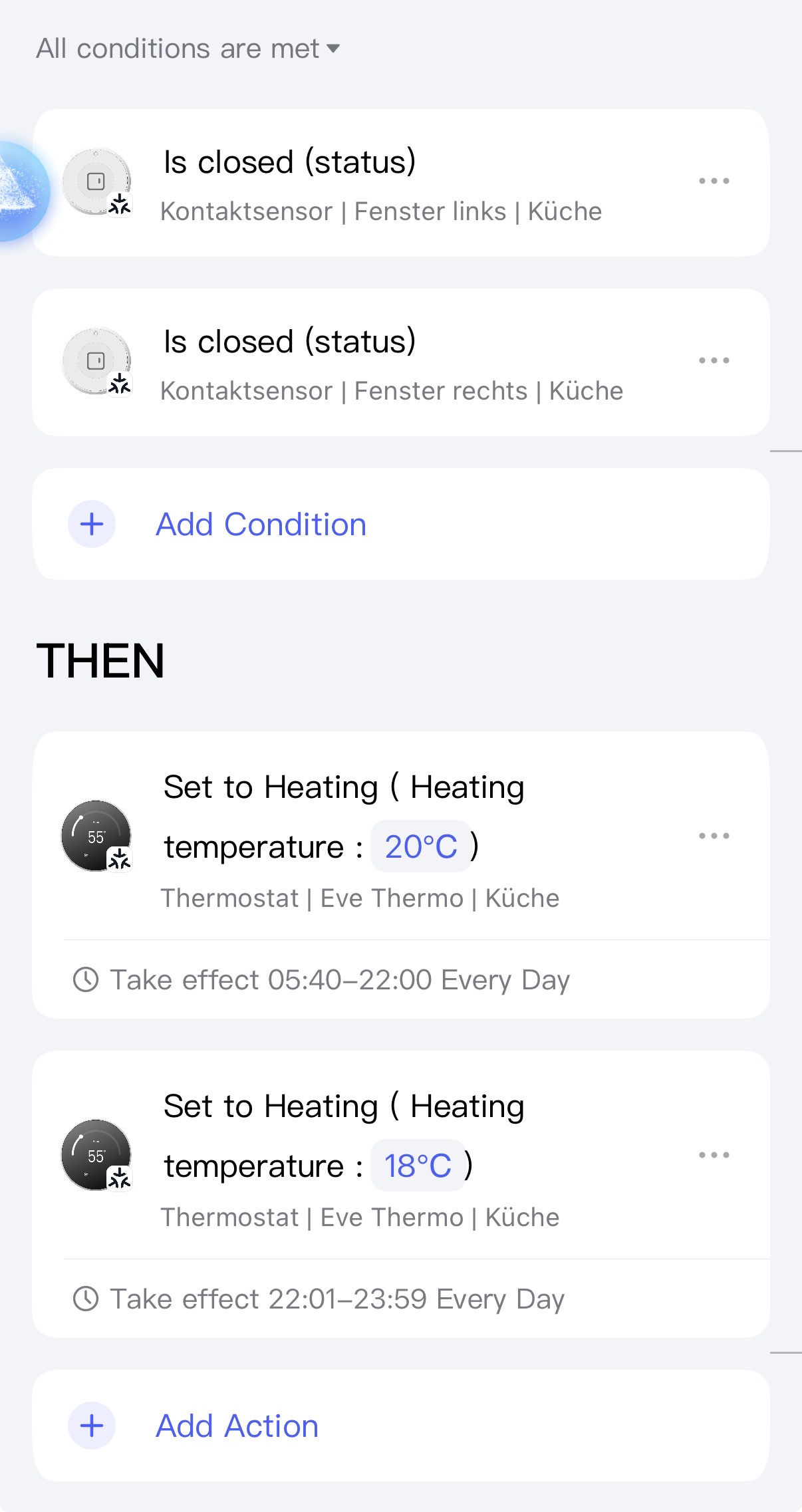 The real benefit comes from linking Eve Thermo with Aqara presence and window sensors. This makes heating more intelligent and avoids wasting energy.