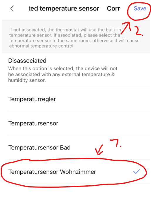 Important: You cannot specify a corresponding temperature sensor for a group. You have to do this individually for each thermostat.
