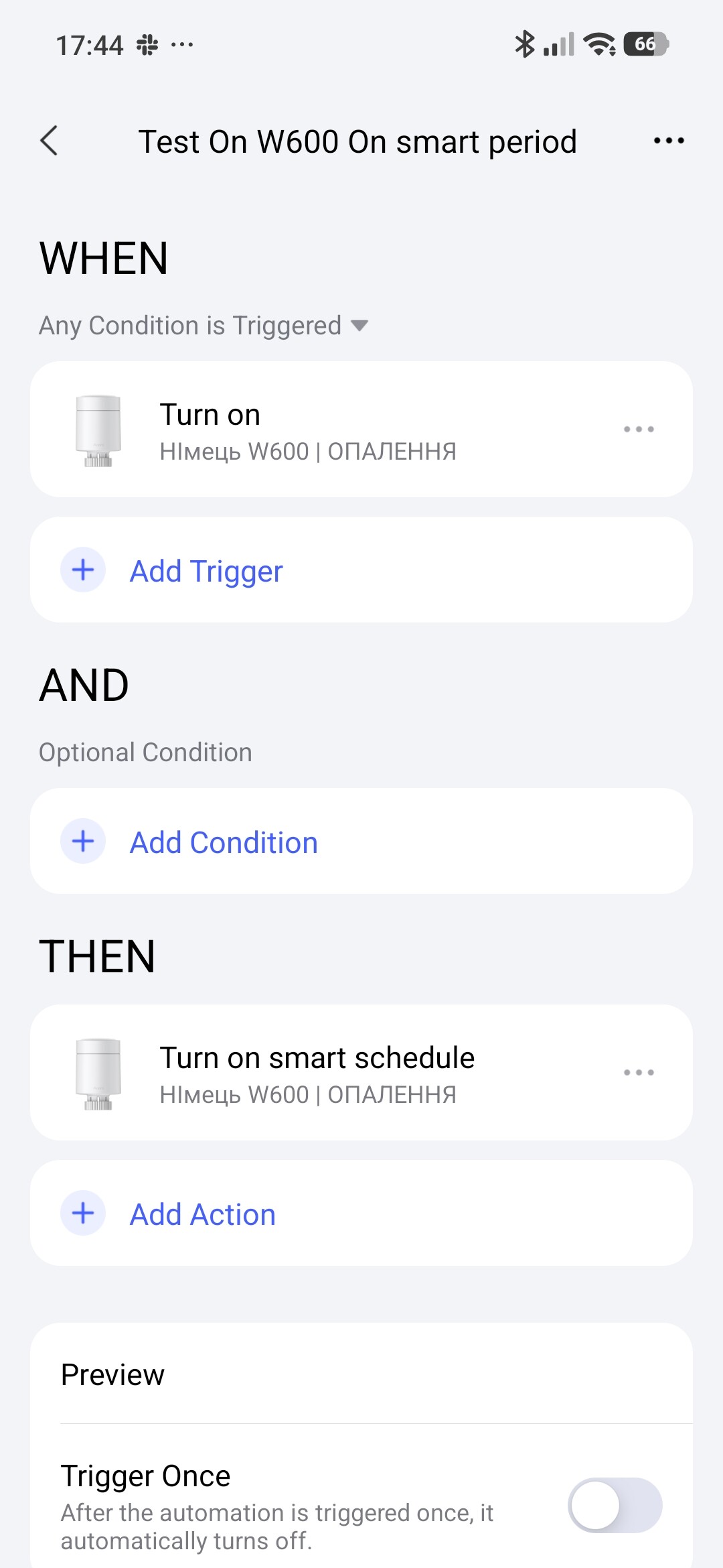Hi, I specifically made two automations. When you turn on the W600, the smart schedule will automatically turn on.